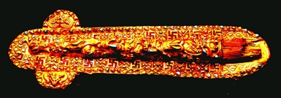 ①蒂拉丘地出土的“雙龍”圖案黃金劍鞘。本報記者 李韻攝/光明圖片