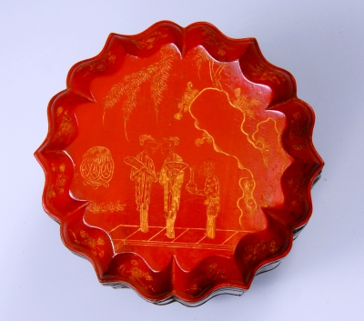 朱漆戧金蓮瓣式人物花卉紋漆奩
