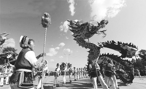 舞龍的隊伍過來了。一條大黃龍扭動著碩長的身軀,張牙舞爪地欲吞下近在咫尺的寶珠,而龍嘴與寶珠始終就差那么一點點距離。龍焦躁不安,舞動起伏的弧度更大了……