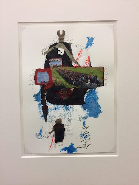 阿多尼斯寫詩有60多年,藝術(shù)創(chuàng)作還只是最近十幾年的事。 他在晚餐桌上告訴我他是怎么開始辦畫展的趣事。他用謙虛的口吻說,他本來只是自得其樂,腦子累了,畫畫作為一種放松。有一天巴黎一個(gè)開畫廊的朋友來他那里做客,看到這些拼貼藝術(shù),問是誰的,阿多尼斯說是一個(gè)朋友畫的,畫廊朋友說特別喜歡,阿多尼斯便和他約好和藝術(shù)家見面。那天到了,畫廊朋友來了,阿多尼斯就拿出他的一些作品讓他看,看著看著,他問藝術(shù)家在哪里,最后才知道阿多尼斯就是那個(gè)藝術(shù)家。