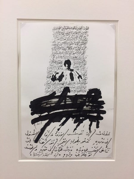 我們到了展覽館,那里展出二十多幅阿多尼斯的拼貼藝術(shù)。他的藝術(shù)作品的背景經(jīng)常是他用鋼筆書寫的阿拉伯文的古典詩詞的摘選,顯示出阿多尼斯對阿拉伯古典文化的熱愛和重視,阿多尼斯說這也是對他前輩的一種尊崇。阿拉伯字母在阿多尼斯筆下翩翩起舞,優(yōu)美如畫。在古典詩詞書法上,他粘貼馬路上撿來的布條,鐵塊,石頭,線,報(bào)紙,并用水墨,通常是黑色和紅色,來勾勒現(xiàn)代社會(huì)和古代文明的沖突和矛盾。他說他寫作寫累了就轉(zhuǎn)向藝術(shù)創(chuàng)作,對阿多尼斯來講,藝術(shù)創(chuàng)作也是寫詩,只是用不同材料來寫。