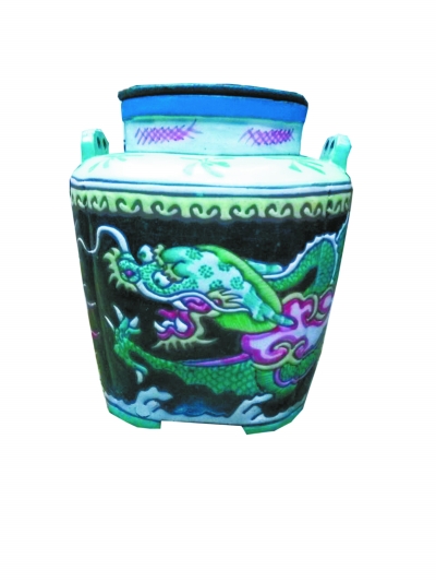 清朝時的紫砂掛釉器物更傾向于華麗。朱銀木收藏的清中期四方倭角龍紋壺,艷麗多彩,盡顯雍容華貴。壺身上的青龍栩栩如生,呼之欲出,而四爪的腳則說明這件器物在當時只有王公顯貴才可使用。這類紫砂彩釉壺不惜工時、精工細作。為了使紫砂器繪上釉彩,需進行二次燒制,甚至三次,即使到了現在也需要10天左右才能完成燒制。“這把壺雖然殘缺了,但我還是很喜歡,它是紫砂掛釉器物中難得的精品。”朱銀木將這把龍紋提梁壺視若珍寶。