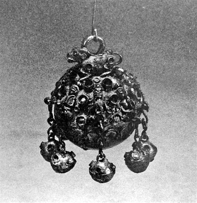 鑲寶石的掐絲胡伎銀鈴制作精致,上有8個樂人正在全神貫注地吹笛、奏排簫、持喇叭、捶鼓。樂人之間系有嵌紅、藍寶石的小鈴。這件文物說明4世紀初的北京已與波斯文明對話。