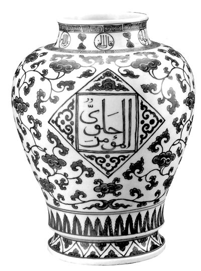 明永樂時期海外貿易興盛,與西亞地區的交流日漸增多,因而出現了一些帶有異域風情的瓷器。這件瓷瓶仿西亞阿拉伯地區金屬器造型及紋樣,腹部輪花紋是阿拉伯地區特有的紋飾。明正德年間,還出現了以阿拉伯文作為瓷器的裝飾紋樣。
