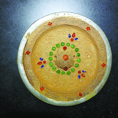 第五件是一面唐代鑲嵌寶石縲絲花卉紋鎏金銅鏡。該銅鏡鏡面直徑108毫米,在纏枝花卉紋的鎏金鏡背上,鑲嵌了紅粉藍綠四種寶石裝飾物。我們現場通過使用便攜式硬度儀,測試各種鏡面鑲嵌寶石的礦物硬度,發現其中紅色寶石的摩氏硬度為5度;粉色寶石的摩氏硬度為6度,應該是瑪瑙石;藍色寶石的摩氏硬度為5度,是一種貓眼石;綠色寶石的摩氏硬度為7度,竟然是滿綠的高冰種翡翠。
