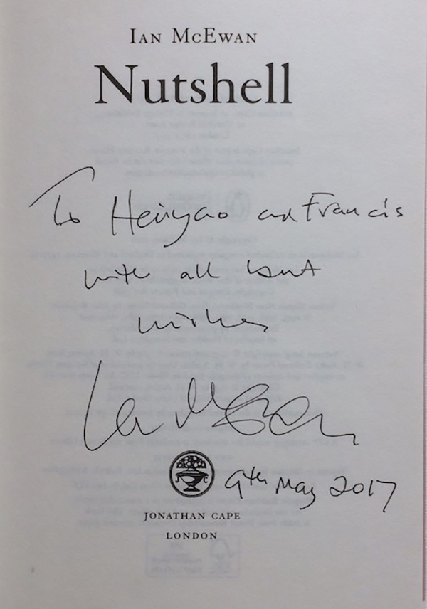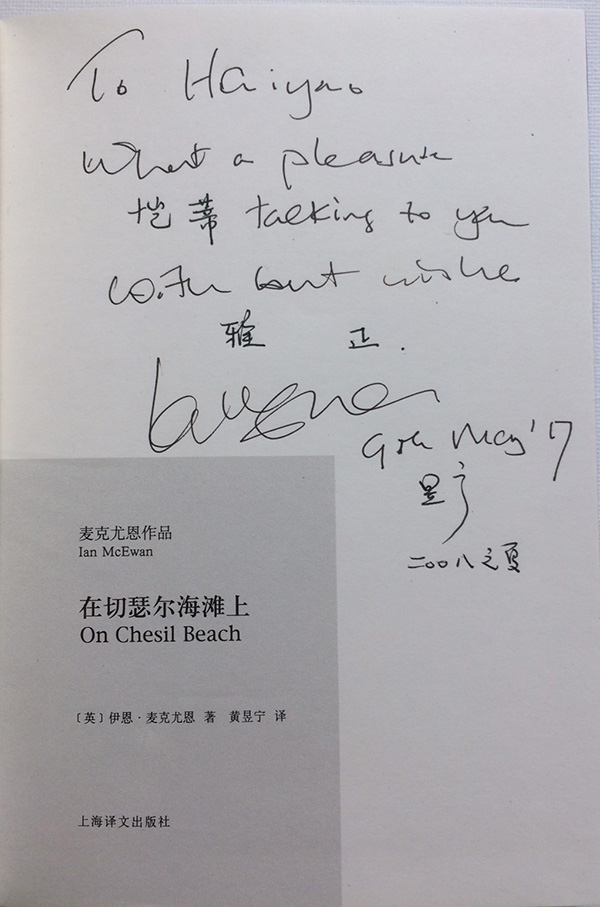出租車的到來結束了我的訪談。我取出一堆書請他簽名,每本他都會仔細問我該簽送給誰,名字怎么寫,又隨他到他三面都是高大書架的書房里找到他那本兒童小說《夢想家彼得》,他說送我兒子最合適。還有一本黃昱寧送給我的《在切瑟爾海灘上》的中譯本,原本是帶去準備留給他的,他說還是簽還給我更合適。我告訴他小黃今年來過倫敦書展,他說他一般總是盡量避免書展之類,但今年他的好友、巴西作家路易斯·施瓦克斯(Luiz Schwarcs)取得倫敦書展終身成就獎,他也前去助威,又說可惜沒與小黃在書展上見面。簽過書后,為他拍照,他立即服從指揮坐在對面光線好的沙發上,用我那摞書墊在手肘下面,擺出正宗書模的架勢。
