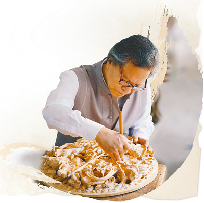山東陽信葫蘆刻畫技藝傳承人陳金泉在展示技藝。 王 劍攝