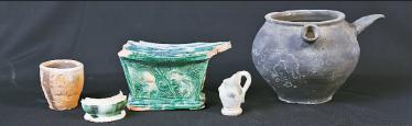 出土的宋金時期藥具,從左至右分別為瓷臼、瓷盒、脈枕、瓷壺、陶壺。資料圖片