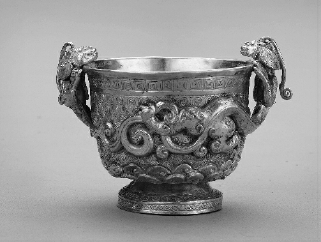 此南宋晚期螭首金杯捶揲成形,兩條盤繞相視的螭,也就是無角小龍在杯身成形后焊接到杯身上。此杯體上層為祥云紋、下層為海浪紋,兩螭似騰飛于海浪祥云之間,充滿動感,是南宋金銀器的代表作。