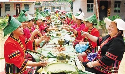近年來,在保亭黎族苗族自治縣毛感鄉(xiāng),借助每年的節(jié)慶活動(dòng)日,各村男女老少,穿著民族服裝,在一片開闊的稻田地里鋪開長(zhǎng)桌宴,招待八方來客。