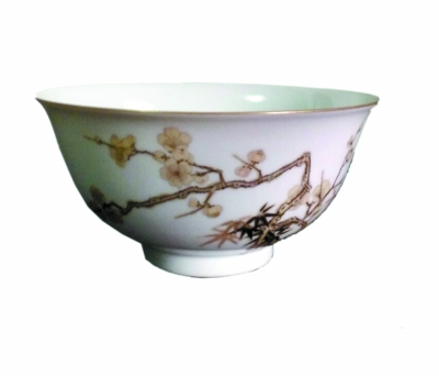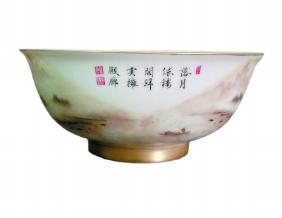 琺瑯彩瓷器中的山水樓閣是常見的表現(xiàn)手法,傳世稀少,十分珍貴。雍正琺瑯彩墨彩山水樓閣人物碗是很有代表性的一件。所謂墨彩,是在白地上繪黑彩。通常以黑地繪五彩或三彩的叫黑彩,墨彩所呈現(xiàn)的簡約、單純、嫻靜使這種瓷器達(dá)到應(yīng)得的效果。