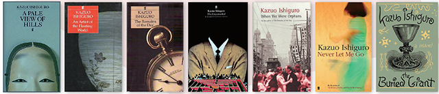 左起:《遠山淡影》英文版、《浮世畫家》英文版、《長日留痕》英文版、《無可慰藉》英文版、《上海孤兒》英文版、《別讓我走》英文版、《被掩埋的巨人》英文版