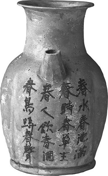 據(jù)周世榮先生的考證和其他學(xué)者的初步清理,已經(jīng)發(fā)現(xiàn)的62首完整的瓷器題詩(shī)中,見于《全唐詩(shī)》和《全唐詩(shī)續(xù)補(bǔ)遺》者共九首,見于其他傳世文獻(xiàn)者一首,另外可確定的先唐詩(shī)一首;其余大多是當(dāng)時(shí)流行的民間詩(shī)歌或窯工們的即興創(chuàng)作。也就是說(shuō),當(dāng)年的窯工中有相當(dāng)一部分人不僅識(shí)文斷字,還會(huì)寫詩(shī)。他們不需要像文人那樣拘泥于詩(shī)學(xué)理論,不需要咬文嚼字去推敲,就是在和泥拉胚或添柴燒火之際,自己心一動(dòng),想到什么順手寫下來(lái),刻在那些器物上:“天地平如水,王道自然開。家中無(wú)學(xué)子,官?gòu)暮翁巵?lái)?”