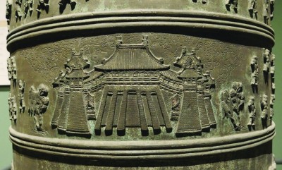 帝王出行的儀物制度即所謂“鹵簿”是我留心的問題之一,這一口難得的鹵簿鐘自然早在關注范圍之內。且不說它的鑄造工藝精良,紋飾繁復而準確,因成考證儀衛制度的難得實證,遍布于不同裝飾帶的建筑、山水、四神、四仙,也都引人注目。雖然它的名氣似乎不夠大,但卻不乏注意到鹵簿鐘重要價值的學者。最是夷考精詳的論述,當推王明琦《鹵簿鐘的年代研究》一文(載《遼海文物考辨》,遼寧大學出版社2000年)。以“年代研究”標題,即因關于鹵簿鐘的時代,有遼代說,金代說,宋代說,至于鐘身的“大清乾隆年造”系后刻,倒是很容易判定,而據此可知它曾入清宮內府。鹵簿鐘下緣朱雀開光的火焰珠左側近口沿處,由右向左斜刻一行“右街僧官(押)宛平縣仰山院(押)”,《鹵簿鐘的年代研究》在多方舉證考訂鐘為北宋物之后,認為這一行銘文是“金代檢驗青銅器物的官員驗記刻文”;“所以流入燕京的仰山院,大體上是和遼寧省博物館藏北宋徽宗時期鑄造的‘大晟南呂編鐘’流入金代上京一樣,在北宋靖康之變,金人破汴梁,掠運到燕京的”。又以“仰山院”之名,可推知驗記刻文的年代,約當金代實行銅器驗記制度的海陵王正隆二年至金世宗賜名仰山院為棲隱寺之大定二年的五年之間。傅熹年《宋趙佶〈瑞鶴圖〉和它所表現出的北宋汴梁宮城正門宣德門》一文,更將鐘的制作年代時代鎖定在北宋末的政和八年——鑄于銅鐘第四層裝飾帶的一座城門,凹字形平面,城樓居中,下開五門,門樓兩側以廊廡與朵樓、兩闕相連。而依宋人記載,汴京皇宮的正門為宣德樓,北宋前中期皇宮正門為三個門道,至政和八年方以蔡京倡言,據唐長安大明宮丹鳳門之制擴建宣德門為五個門道,即整個北宋“僅僅在最后九年才在汴梁宮殿中建了一座五個門道的城門,其他時間地點均無可能,所以鐘上的門樓形象應是擴建后的宣德門”(《傅熹年書畫鑒定集》,河南美術出版社1999年)。城樓名稱既得以確定,銅鐘擇要表現的大駕鹵簿且以環形而寓出與入之意,自可與祥云蔚繚的宣德門構成完整的敘事,那么其下有類于“千里江山”的一周山水圖,也就不是純然的風景。