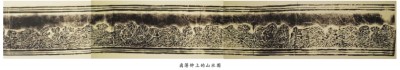 山谷,溪水沿谷底而流。左上方,有一亭式建筑倚立于左三山的山坳之前。右山腳下的溪水邊,停泊著一小木舟,景象異常恬靜。第三個空間,則是第二個空間左三山向左的延續,在畫面最左面的山坳間,亦有兩座茅屋隱現。有的茅屋頂上挑著一面小旗,是為酒肆的標志。從整個畫面看,近景是峰巒迭嶂,遠景則是山勢連綿。樹木、溪流、小橋、木舟、茅屋、酒肆等點綴其間。”“就鹵簿鐘飾紋帶所表現的山水題材來說,也具有北宋繪畫中山水長卷的時代特征。”