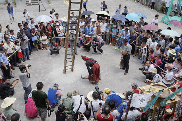 刀是真正帶著利刃的刀,一把一把均勻地釘在木梯上,下方以紅布覆蓋。照例是冗長的祭祀和表演,法師頭戴神額,身著紅色長裙,手持龍角、靈刀、震鈴,吹一陣,跳一陣,唱一陣,誓要吊足了看客的胃口才徐徐走向刀梯。我不錯(cuò)眼珠地盯著那雙腳,踩過一層一層的利刃,毫毛未傷。在梯子的最高處,他還悠閑自在地從腰帶上拔出了龍角,又來了一番煞有介事的表演。