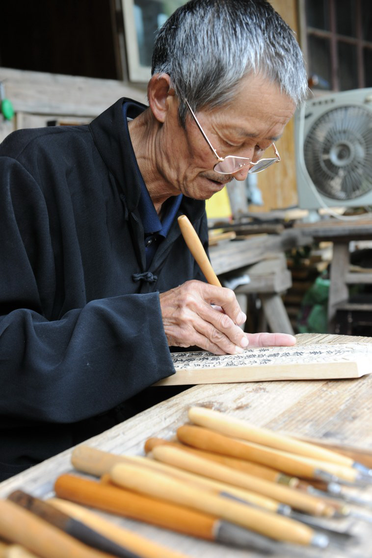 我問老人,你有徒弟嗎?老人搖搖頭,用含混的語音說沒有。而他的這手技藝,還是在20多歲做木工時(shí),偶遇一位80多歲的老人學(xué)來的。當(dāng)時(shí)老人指著祠堂對他說,這些牌位如果沒人做,就要失傳了,以后祠堂就會空空的。斯人將去,祖風(fēng)難存,我能想象一個(gè)80多歲老人的悵然。這份悵然果然打動了藍(lán)土成,他拿著老牌位自行研究,竟逐漸形成了自己的一套雕刻技藝。現(xiàn)在,各村各家擺放的牌位,多出自藍(lán)土成之手。40多年光陰轉(zhuǎn)瞬即逝,他卻至今沒有找到一個(gè)合適的傳人。