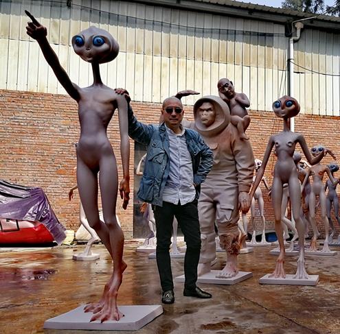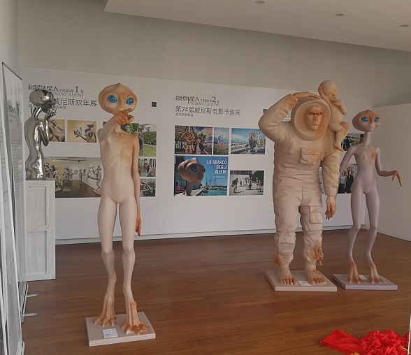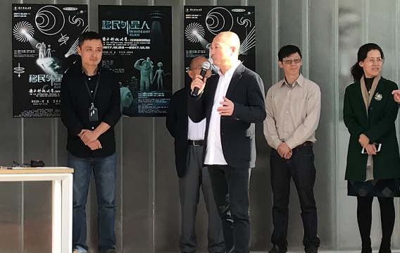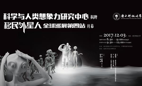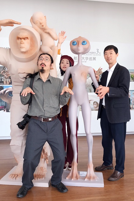 來自重慶畫院的跨界藝術家傅榆翔的全球巡回展覽《移民外星人》,是“科學與人類想象力研究中心”成立之后第一場活動。《移民外星人》被譽為史詩般宏大而又指向未來的雕塑裝置作品。該作品采用“超現實”手法,通過移民外星人隱喻人類當前和未來的困境和出路:一方面,科技正在帶領人類發現全新的宇宙;另一方面,人類自身卻異化于以往熟悉的環境。移民外星不單從社會人類學考證人類和歷史,也從未來學角度思考當下的多元時代。
