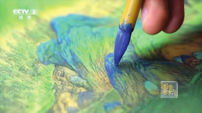 ▲中央美院的老師馮海濤在多年研究后用兩個(gè)月復(fù)制了十分之一的《千里江山圖》卷。他在節(jié)目中還原王希孟作畫(huà)步驟,告訴觀眾——中華民族一代代都有藏樸守拙的匠人。他們守護(hù)瑰寶。因?yàn)樗麄儯腥A文明經(jīng)五千年賡續(xù)不斷,有了鮮活寫(xiě)照。圖為馮海濤復(fù)制十分之一《千里江山圖》卷的畫(huà)面。(節(jié)目截圖)