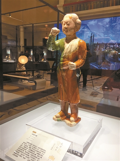 展廳中央右手邊的點式展柜中,一尊三彩胡人俑右手握拳上舉,左手握拳前伸,梳著典型的西域人的發(fā)型。閻焰介紹,該人物有可能是和駱駝、馬組成的“牽持俑”,而從左側腰后部掛籃彩半球形皮囊看,該人物可能是“胡商”,這種俑常見于中唐之前的墓葬。