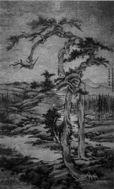 而藏于臺(tái)北故宮博物院的《雙松圖》也是代表。此圖在吳鎮(zhèn)作品中署年款最早,題款中有“泰定五年”數(shù)字,則此圖應(yīng)為1328年作品,吳鎮(zhèn)時(shí)年49歲。