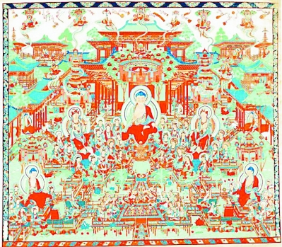 “我父親總結(jié)過敦煌壁畫臨摹的三種方法——客觀臨摹、整理臨摹和復(fù)原臨摹。張大千先生用的就是復(fù)原臨摹。他有一種觀念,就是現(xiàn)在看到的壁畫上是黑的區(qū)域,實際上是氧化了,原來肯定是紅的,所以,他的臨摹作品大部分都是紅的或綠的,這樣的色調(diào)成了張大千先生特色的復(fù)原臨摹。我也用張大千先生的方法去臨摹過一些壁畫,最后得到的畫很鮮艷。后來,我們認(rèn)為應(yīng)該要對壁畫色調(diào)進(jìn)行分析,哪些是氧化了的。原來是大紅的,我們要把它畫成紅的;有的是水紅,又變了顏色。張大千先生的臨摹成果和特色,后來成為臨摹壁畫很重要的參考。”常沙娜女士說,“現(xiàn)在,張大千先生的臨摹品已經(jīng)成了他的一個特色。離開敦煌以后,他又創(chuàng)作了許多新的作品,也按照敦煌的風(fēng)格來改進(jìn)他的人物繪畫作品——勾線開臉,表現(xiàn)得特別精細(xì)。”