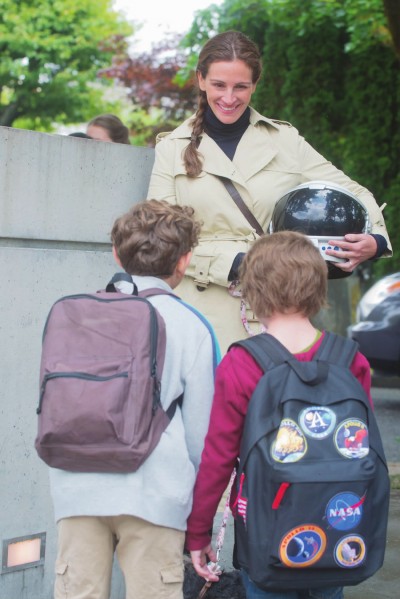 天生面部畸形的奧吉(右),習慣了用頭盔保護自己。圖為電影《奇跡男孩》劇照,茱莉亞·羅伯茨飾演奧吉的母親