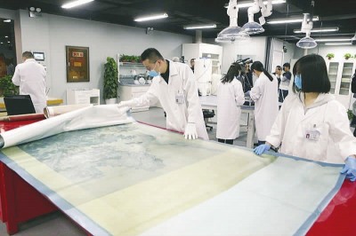 一面超大的電子監控屏,將130平方米空間的角角落落展露得真真切切;三個形同無影燈的大罩燈下,大紅漆案上平鋪著一幅待修的清代《百鹿圖》;西墻上,是慈禧太后御筆《歲歲平安》朱砂拓片,北墻上是正在修復的一幅《福祿圖》……幾位戴口罩的修復師正在小心翼翼地侍弄著……