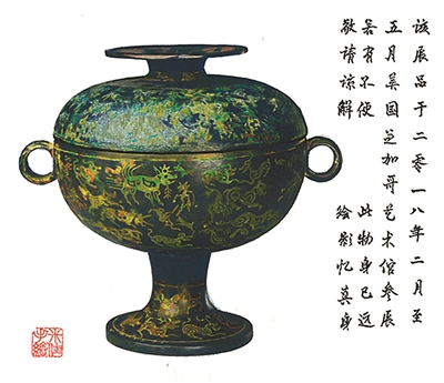 據了解,用繪畫作品代替外出參展的國寶文物,在故宮還是第一次,以往只是在空空的展柜里立個牌子說明,現在的做法顯然更人性化。令人驚異的是,這些畫的作者并非畫家,而是故宮博物院研究員、古器物部金石組組長、著名的青銅研究鑒定專家李米佳先生。“別人在故宮修文物,我是在故宮畫文物。”李米佳笑言。
