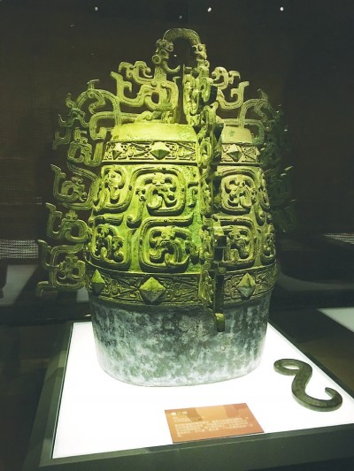 再往前走,看到了一件“秦公鐘”和一件“秦公镈”,均由寶雞青銅器博物館供展。記者查閱相關資料得知,出土時一共有8件銅器,其中鐘5件、镈3件,上面均有銘文。銘文合計135字,據釋文,主要是頌揚秦國先祖的業績。銘文記錄到了秦憲公之時,再結合行文的口吻,學界基本推斷作器者是憲公之子秦武公。武公征服了周邊戎族,使秦國勢力達到關中渭水流域。在鐘和镈旁,各有一個S型的鉤狀物。馬今洪解釋,這個鉤狀物是掛鐘、镈用的。镈敲出的是單音,鐘敲出的是雙音,鐘的敲擊點一個在下方的中心位置,一個在右下側鑄有小鳥圖案的地方。“有了雙音鐘,就可以用數量較少的鐘構成完整的音階了。”馬今洪說。