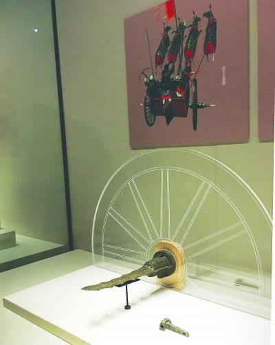 繞到下一個展廳,只見一個模擬的半個戰車車輪的車軸位置,豎插著一把劍似的物件。“這就是當年的‘大規模殺傷性武器’。”熊建華介紹,這是戰車上的矛狀車軎,1978年出土于湖北隨縣曾侯乙墓。矛狀車軎在使用時,軎轄朝上,矛葉與地面平行,在戰車行進時,可殺傷車旁之敵。“在戰國時代,為提高戰斗力和殺傷力,各類兵器與防御裝備都在迅速改進。”