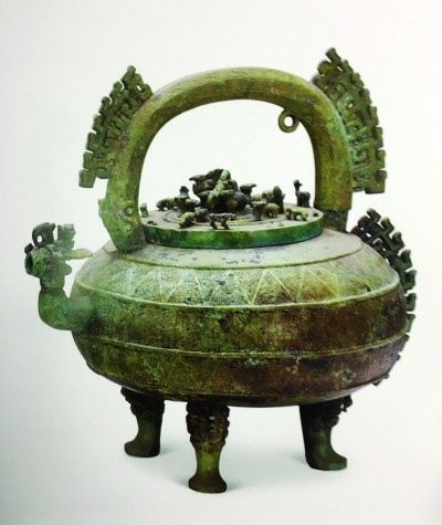 “這個銅盉借調到上海博物館展出時,我曾經仔細看過,非常有意思。”馬老師把我們帶到一個中心展柜前,內中展示的是由浙江省博物館送展的“螭紋提梁銅盉”。定睛看器蓋,只覺好似走進了動物園,上面立體地雕塑了犀牛、大象、老虎、熊、鹿等獸類,足有16只。在這些動物四周,堆塑著11條形態似蛇的螭龍,有的正在大快朵頤,有的昂首好似在下咽,有的豎起上身像在尋找獵物。“你看,這條螭龍在吃什么?”見記者似乎迷失在“動物園”中,馬老師靈機一動,掏出手機選好角度“咔嚓”一聲,而后指著手機屏幕道,“就是這條,你看它在吃什么?”熊建華問:“是不是青蛙?蛇吞蛙的主題很常見。”馬老師搖搖頭:“你們看,這眼睛瞪得大大的,嘴巴張開,高舉雙手……這是個人,他的腳已經被螭龍吞啦!”聽到這兒,熊建華興奮起來:“你說,這會不會就是 ‘饕餮紋’的立體形象呀?”