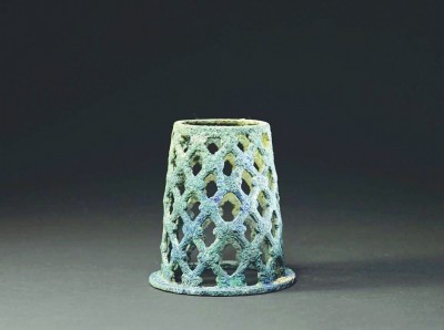 展覽中,年代最早的一件展品是戰國時期的絡紋熏。據考證,這應是一種與熏爐配套使用的熏籠。有記載顯示,早在漢代,熏香已經在貴族中廣泛流行,出現了專門用于熏香的熏爐,以及能直接放在衣物中用來為衣服、被褥熏香的熏籠。唐以后,熏籠的使用更為盛行,詩人白居易 《后宮詞》 中便有“紅顏未老恩先斷,斜倚熏籠坐到明”的詩句。而許多畫家也曾用畫筆描繪閨閣、僧道、文人的用香情景。比如,此次展出的陳洪綬的 《斜倚熏籠圖》 堪稱明代生活用香的經典之作:美麗的女子斜身倚靠熏籠,裙裾招展,熏籠下放置一鴛鴦形香爐。古人不僅以詩書畫詠香,更發揮聰明才智,打造出各式各樣的香具。展出的一件清代的透雕鎏金爐,便是其中的代表。這個香具做工十分精美,蓋頂飾一獅子,蓋面隆起為鏤空的纏枝花紋。這件器物同時運用了錯金和鎏金兩大工藝,器表經過特殊處理呈現三種不同的顏色。蓋底部有款識“造辦處制”,乃是專供內廷和皇家使用的器物。