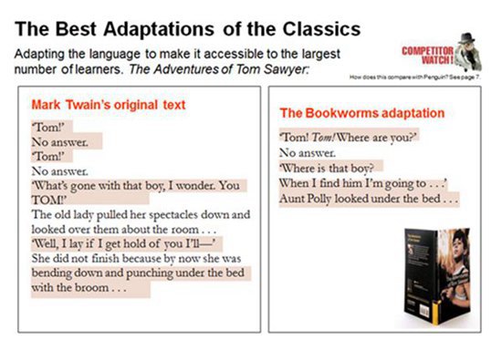 芭斯特強調,重寫經典小說并不僅是簡化語言和縮短長度。“成功的改寫,首先要遵守的原則,就是符合原著中作者的原意。所以,必須詳細分析原著,包括其敘事結構、人物描寫、修辭格……之后,改寫者要建立一套全新的敘事結構,遵守‘書蟲’系列各個分級類別的用詞原則,根據原著的核心精神,創建全新的文本。”