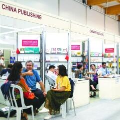 在第28屆耶路撒冷國(guó)際書(shū)展上,一名書(shū)商(左二)與中國(guó)參展單位洽談。圖為新華社發(fā)