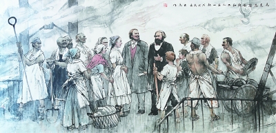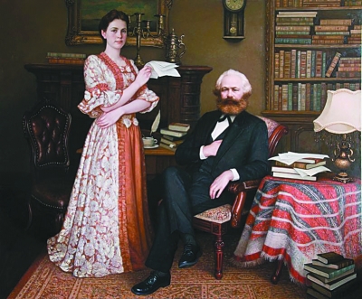 “馬克思題材繪畫作品創作”是美術界為紀念馬克思誕辰200周年而推出的一項重量級獻禮活動。此項活動由中央編譯局、中國文聯主辦,中宣部理論局和文藝局參與,中國美協承辦。活動圍繞馬克思生平的重大歷史事件和重要人生節點,請各地美術家以油畫和國畫為表現形式創作了24幅馬克思題材作品。在今年年初舉行的“馬克思題材繪畫作品創作工作會”上,中央編譯局的專家和北京大學、南京大學的教授也參與其中。在創作過程中,中國文聯、中國美協的領導和馬克思研究專家還走進部分美術家的工作室進行觀摩指導。根據中國美協提供的作品名錄來看,從《馬克思童年時代的特里爾城》到《寫作〈共產黨宣言〉》,從《在倫敦德意志工人教育協會作報告》到《〈資本論〉在工人之間傳播》,從《在國際工人協會(第一國際)成立大會上》到《滿腔熱情支持巴黎公社》,從《晚年關注俄國和東方經濟落后國家的發展道路》到《延安時期學習馬克思主義蔚然成風》,24幅作品基本上按照時間脈絡排列,其中群像型作品占比較大。馮遠的中國畫《在國際工人協會成立大會上》呈現出一種蒸騰的動感,現場氣氛令人激動,工人們將帽子拋向了空中,這是一種多少文字也寫不出的熱烈場面,讓人真正感受到了美術的力量。劉大為的中國畫《馬克思、恩格斯與工人代表們在一起》描繪了馬克思、恩格斯到工廠考察調研的情景,領袖和工人打成一片,讓人讀出了思想與勞動結合在一起的神圣。蘇州科技大學傳媒與視覺藝術學院的王嫩教授是江蘇唯一受邀參加“馬克思題材繪畫作品創作”的藝術家,因而受到了當地新聞媒體的廣泛關注。據《姑蘇晚報》等媒體報道,今年1月5日,王嫩受邀赴京選定題目《終身伴侶》,回蘇州后一個月閉門創作初稿,2月5日再赴京接受中央編譯局專家審稿“挑刺”,通過審核后即趕回蘇州加班加點,連大年初一都在進行創作。上個月中央電視臺《不朽的馬克思》專題片攝制組曾前往蘇州王嫩工作室進行現場采訪,北京電視臺亦專程赴蘇跟蹤拍攝創作進程。