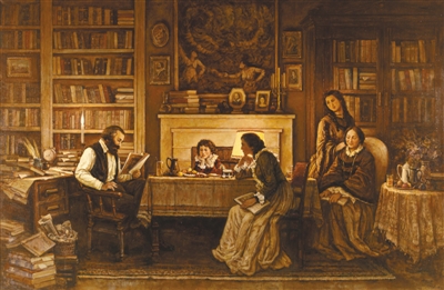 孫景波的《革命的一家人》描繪了一個安詳寧靜的夜晚,燭光下、壁爐前,馬克思的家庭詩歌朗誦會正在進(jìn)行。這是一個享受莎士比亞詩意的美好夜晚:二女兒勞拉依偎在母親燕妮身旁,大女兒小燕妮坐在桌前出神地凝視著父親的表情,不滿八歲的小女兒艾琳娜,看著爸爸動情的樣子,眼神里充滿喜悅和好奇。此刻,馬克思自己也沉浸在詩意之中,他的手指伴隨著朗讀的節(jié)奏,下意識地在坐椅的扶手上敲打著節(jié)拍。馬克思的家庭,是一個令人敬慕的、偉大的革命家庭。他的妻子燕妮,不僅是他生活、生命中親密的終身伴侶,而且是他思想的、革命事業(yè)的堅定不移的同志和戰(zhàn)友。燕妮和馬克思的三個女兒,在他的影響下,也都先后成為馬克思思想的繼承人和無產(chǎn)階級革命事業(yè)的杰出戰(zhàn)士。