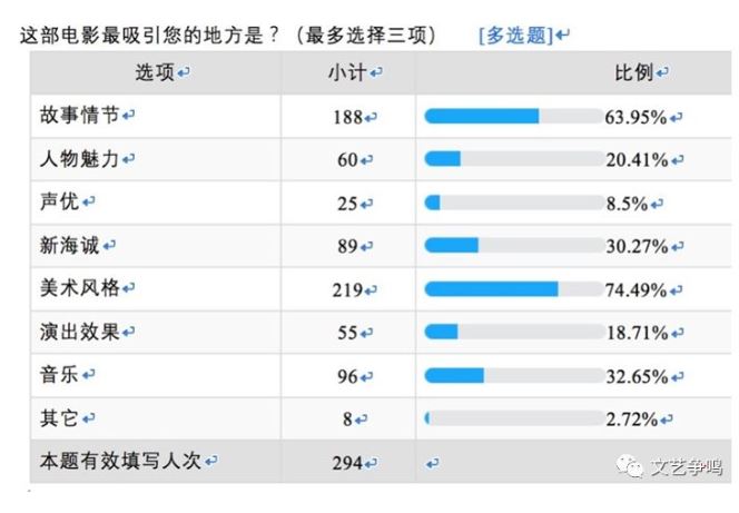 接受調研的人群的審美傾向可以顯示這部電影有趣的一個層面:它以“普通電影”的身份進入大陸電影消費視野的,并非像此前的宮崎駿電影那樣,具有定向吸引觀眾的特色。如圖——
