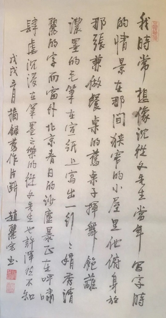 不過,看沈從文的這幅字,更多時候使我感受到的,是中國文字的優雅和奇妙。我常常想象沈從文當年寫這幅字時的情景,在那間狹窄的小屋里,他俯身于那張兼作餐桌的舊桌子,揮舞飽蘸濃墨的毛筆,在宣紙上寫出一行行狷秀清麗的字。而窗外,北京春日的沙塵暴正在呼嘯肆虐,沉浸在筆墨之樂中的沈先生大概是渾然不知的吧。