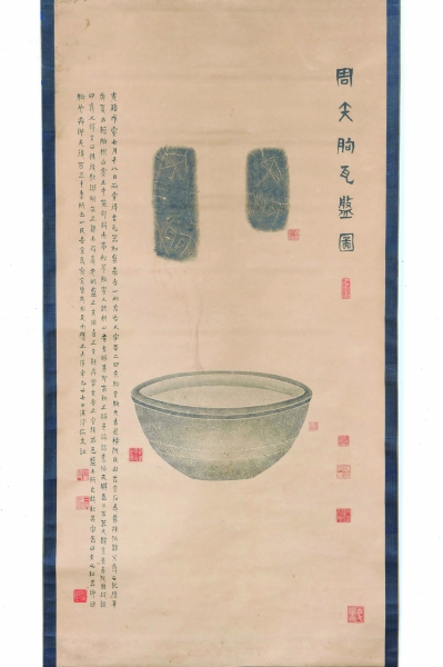 山東省濰坊市博物館藏周矢朐瓦盤拓軸,紙質,縱103厘米、橫51厘米。該拓軸由著名拓工姚學桓繪圖刻版拓墨、金石學家陳介祺考釋題跋,并經民國收藏家周振湘收藏,具有較高的學術價值。