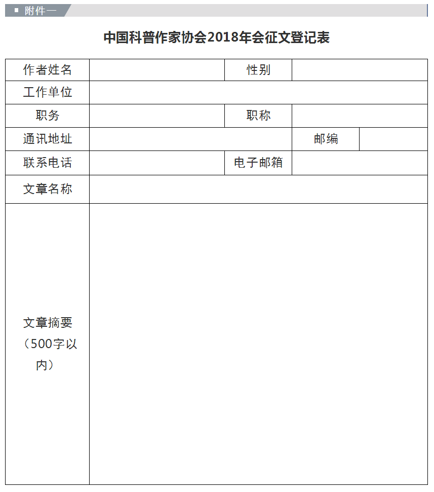 歡迎廣大會員、科普創作愛好者以及科普創作相關領域的各位同仁、專家學者積極撰寫文章并參會。 會議將從投稿文章中遴選優秀文章,在會后結集印發《中國科普作家協會2018年會文集》,并擇優在中國科普作家協會微信公眾號、中國科普作家網和《科普創作》等平臺發表。有意參會者,請于2018年8月31日前將文章發送到:kpcswa2017@163.com。E-mail主題行請標明:中國科普作家協會2018年會投稿。凡提交文章符合參會條件者,將于2018年9月下旬收到正式參會通知。