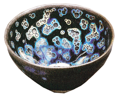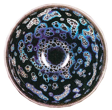曜變天目盞在陶瓷界一直是傳說般的存在,它靜靜地陳列在東京靜嘉堂文庫,給予觀者的視角高度極佳,能夠剛剛好看到內壁中的藍色窯變圓點。內壁有2 / 3的面積曜變斑點比較集中,白色、紫色、藍色湊成了點點圓斑,釉水賦予的鮮明金光時隱時現。壓低手持望遠鏡的視角,鏡頭變焦和對焦過程中,那藍色斑點和“五彩”炫光交織在一起。圍著天目盞轉著圈欣賞,隨著視線的移動,藍色圓斑的顏色會變幻不定,瑰麗奇詭得不像是人間之物,甚至透出一種“近乎妖”的感覺。那些藍色的曜變色彩很是沉穩,并不輕佻,像極了深夜晴空的星斗,這種體驗非常玄虛。這抹藍色閃著釉光,與黑瓷簡直是絕佳搭配,既顯出黑色的高級又突出藍色的高貴,可謂顏色審美中的罕見之作,難怪被人稱為“碗中宇宙” 。曜變,之所以難以復制和再現,是因為團團簇簇的藍色圓斑實在是一場“星辰宇宙”般的意外,這種不可控才是它令人難忘的原因。