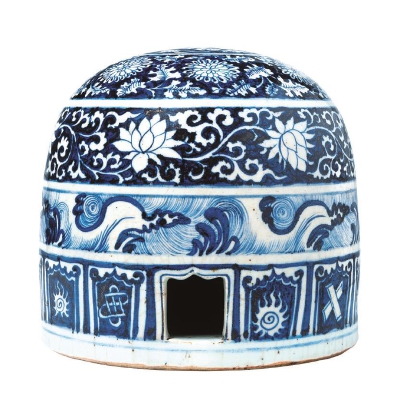 此件青花瓷“蒙古包”形器完好無損,從造型看:上半部呈半球形、下半部為圓柱體,平底,下方開有裝飾壸門的龕式小門;從裝飾看:表體施釉、白底青花為主,紋飾分五層,頂部圓心繪“穿云飛鵝”,之下依次為 “纏枝菊花”、“纏枝蓮花”、“海水卷浪”和“焰珠雜寶”。該器整體高18厘米,底部直徑18.5厘米。目前,對其時代判斷、造型詮釋、用途分析、紋飾寓意都有各種不同的理解。艾爾米塔什博物館認為 “蒙古包”形器可能燒制于1345至1355年,胎、釉、青花料和繪畫品質都很高,推斷是景德鎮為蒙元宮廷特別生產的;而彭濤先生則認為,從圖案可見,其纏枝蓮紋的蓮葉已全部是卷草紋樣式,是明初洪武的風格。但將此器的時代推定在14世紀后半葉的范圍內是大致沒有爭議的。