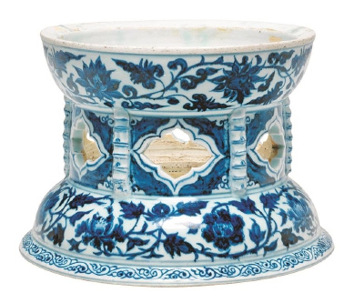 這使我們聯想到另一件元青花瓷器——英國劍橋大學菲茨威廉博物館收藏的一件 “青花纏枝花卉紋鏤空器座”,高28.9厘米、口徑 23.5厘米、底徑27.4厘米,整體圓形,由上、中、下三部分組成。“上部敞口,中部束腰,下部外撇,整器上下貫通,中空……上部外壁繪纏枝蓮紋;腰部以凸起的半埋式竹節狀豎棱分割為六面,每根竹節狀豎棱都有七節,在每節上都用青花繪線條,腰部的六個面均有一鏤空的菱花形開光,開光周邊空白處也均用青花紋飾填滿;下部外壁繪纏枝牡丹紋,足墻為一圈卷草紋。”