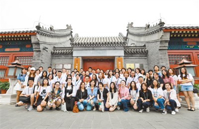 首批預(yù)約觀眾和文物醫(yī)院志愿者在故宮文物醫(yī)院門前合影。 新華社記者 劉 潺攝