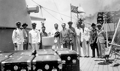 參加中國(guó)藝術(shù)英倫國(guó)際展覽會(huì)的中英工作人員與英國(guó)海軍重巡洋艦“薩福克”號(hào)艦長(zhǎng)等合影(左四馬衡,左五為鄭天錫特派員,右二為莊尚嚴(yán),右四為唐惜芬) 資料圖片