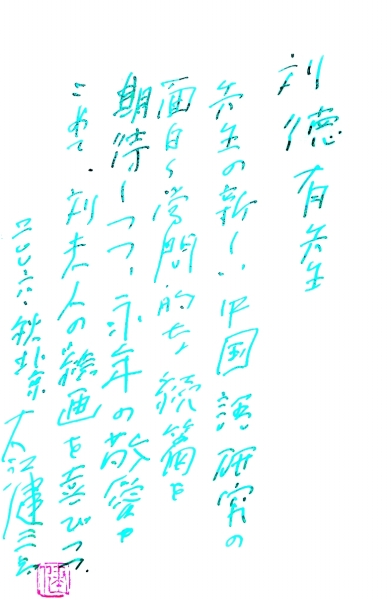大江健三郎在贈給劉德有的《別了,我的書》(中文版)扉頁上寫的話