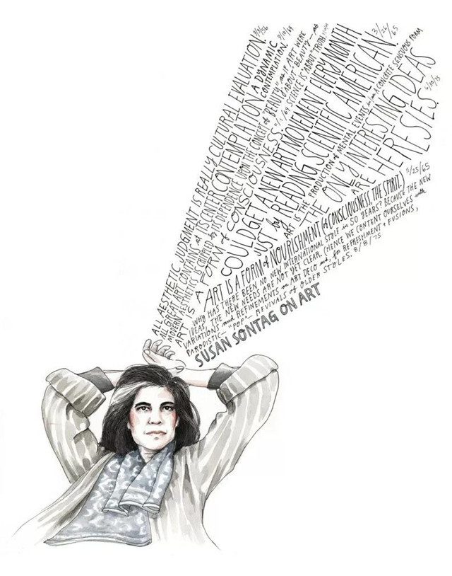 在她的筆記中,你可以不斷看到她自我神話的行為和努力,她堅持不懈地攝取各種生命的原材料,并把它們整合為一種觀念:自己是非比尋常的。當(dāng)然,每個人都這么做,但是桑塔格在做這件事的時候,比別人多了百萬倍的投入,強(qiáng)度也更大,因而也更加成功。她的神話無所不包,充滿誘惑。她的一個朋友評論道,她有一種“明星氣質(zhì)”,不是指她的美貌,而是指她尋求關(guān)注的欲望,以及對神話的自覺運(yùn)用。她在日志中斥責(zé)自己:“不要有太多的微笑。”“軟弱是一種傳染病。強(qiáng)者理所當(dāng)然避開弱者。”最令人嘆為觀止的是她想成為那種人的意志,她不斷地自我修煉,縫縫補(bǔ)補(bǔ),仿佛這種意志是一篇文章。她二十四歲時寫道:“在這本日志里,我更加坦率地表達(dá)了自我,這一點(diǎn)在我表達(dá)任何其他人的時候是做不到的,但是不僅僅如此:我創(chuàng)造了我自己。”