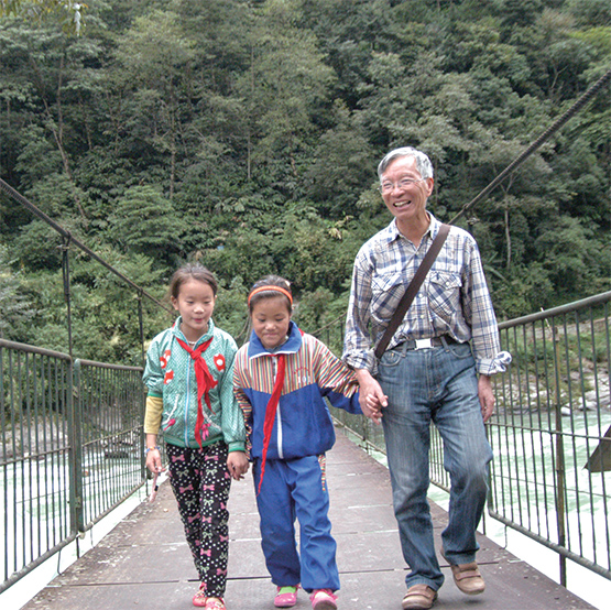 吳然和孩子們。馮牧筆下巴坡小學旁古老的藤索橋,如今已是安全牢固的鋼索吊橋