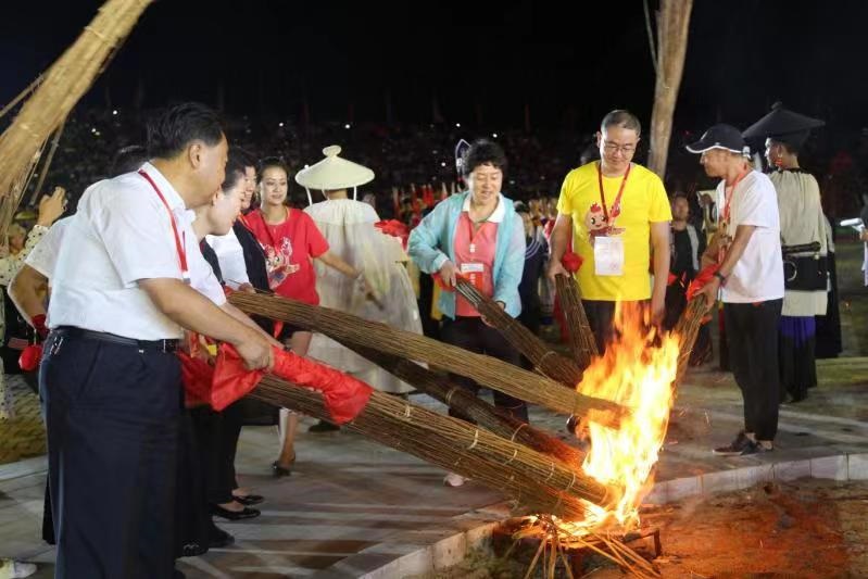 火把節狂歡活動上,西昌市委書記李俊(右二)和國內外嘉賓共同點燃熊熊的火把。(李春攝)